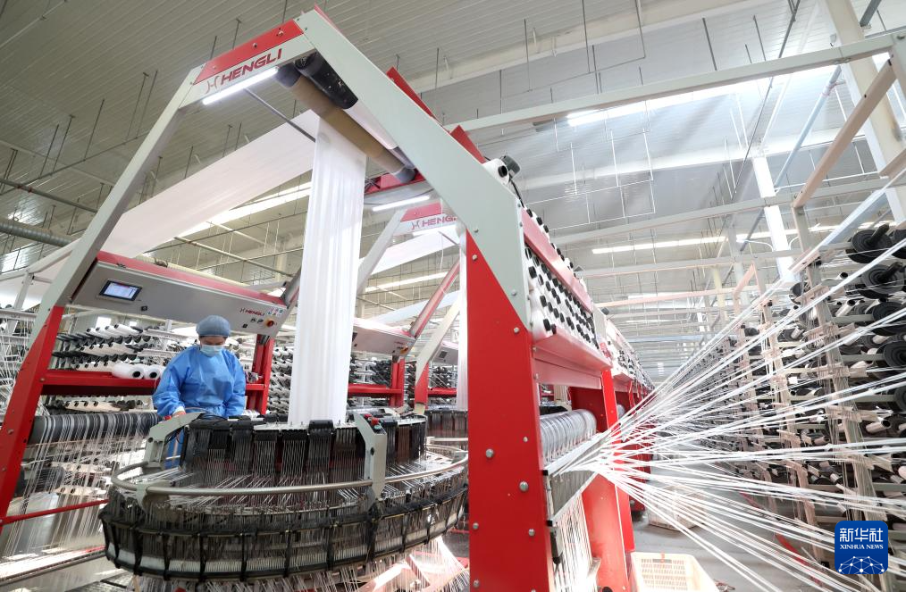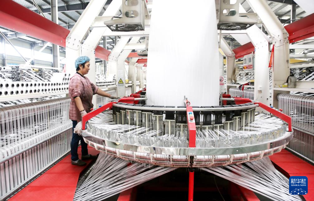 10月8日,在河北省石家庄市行唐县一家包装袋生产企业,工人在圆织车间工作。
