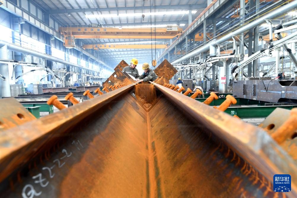 10月8日,在河北省石家庄高新技术产业开发区金环建设集团有限公司生产车间,工人对桥梁钢构件进行检查。