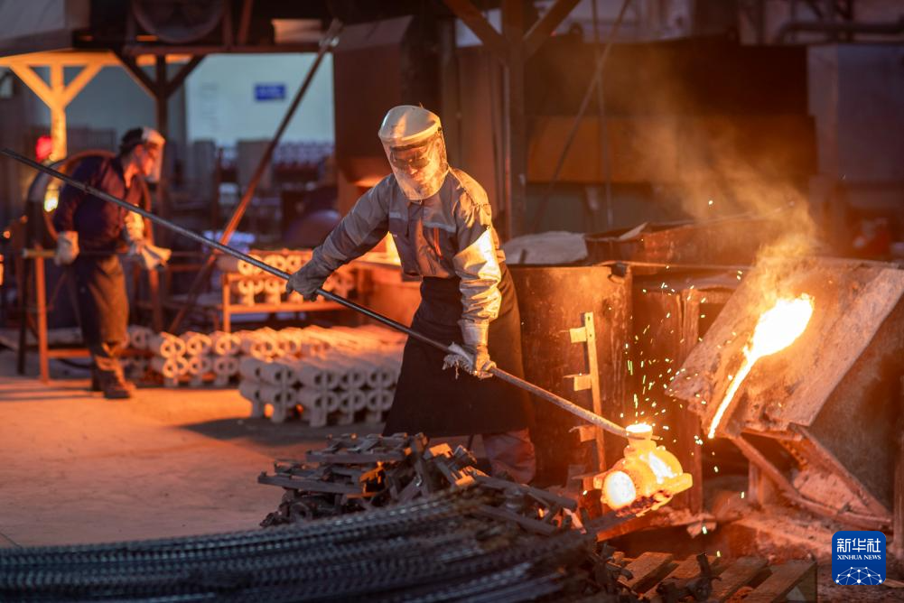 10月8日,在江苏省兴化市陈堡镇的泰州华丰精密铸造有限公司,工人在生产车间熔炼作业。