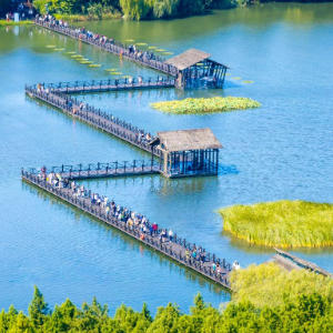 游客在江苏省泰州市姜堰区溱湖国家湿地公园游玩(10月2日摄,无人机照片)。