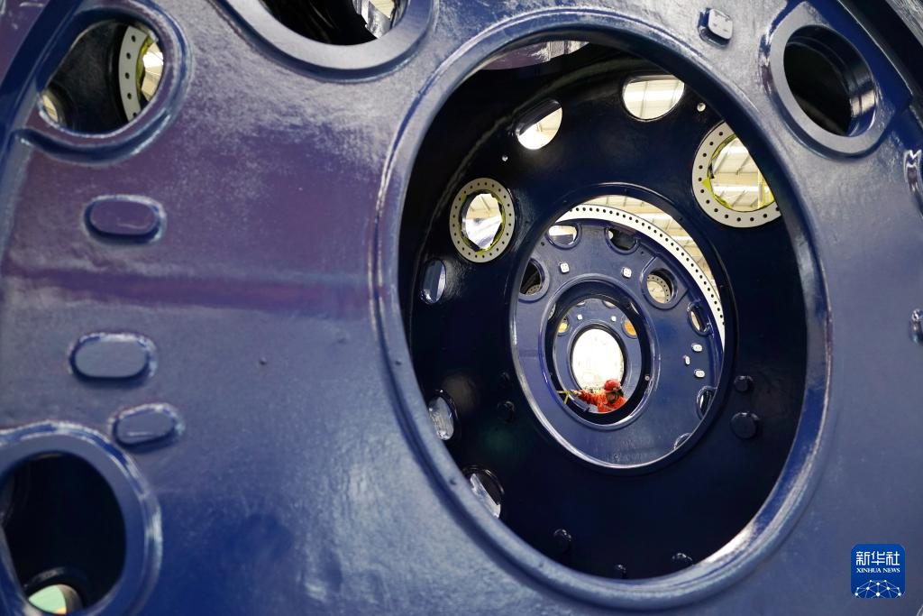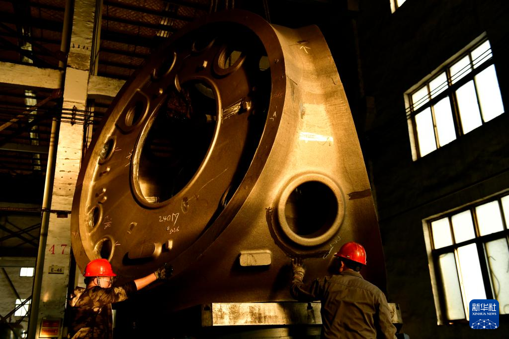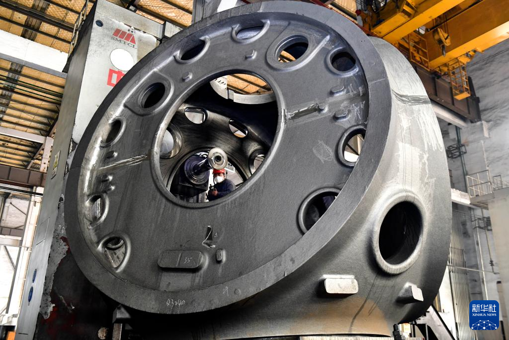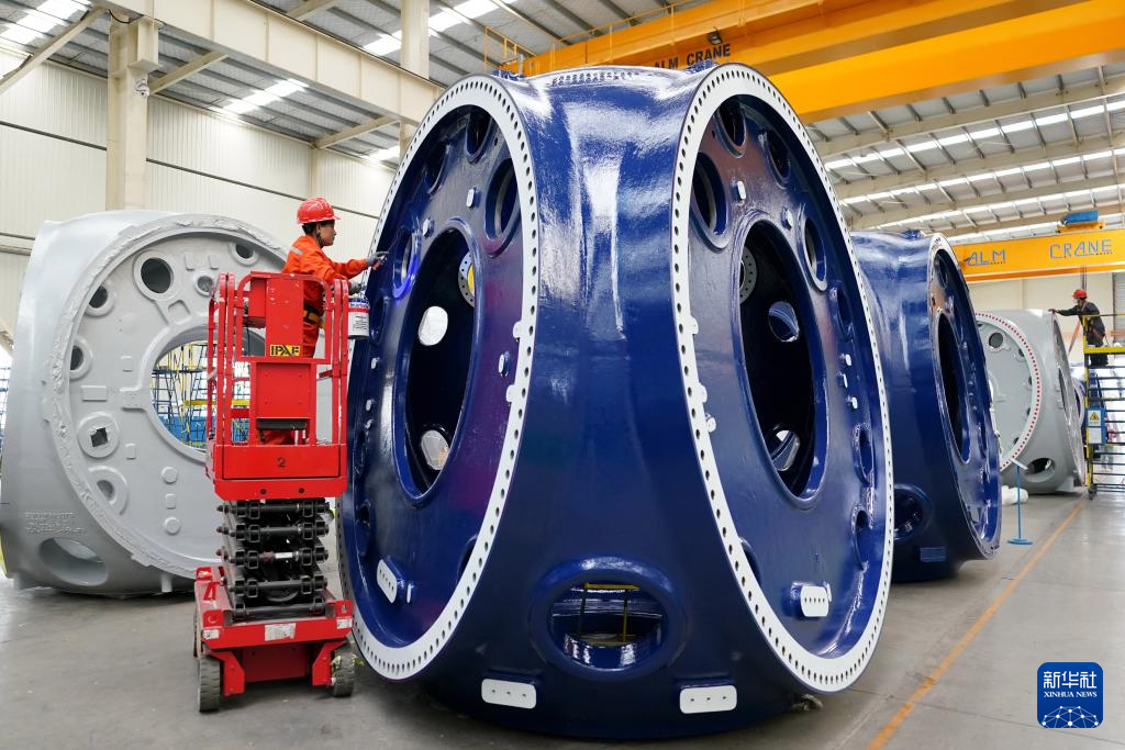 10月8日,在惠民县风电装备制造产业园,工人在加工风电轮毂。