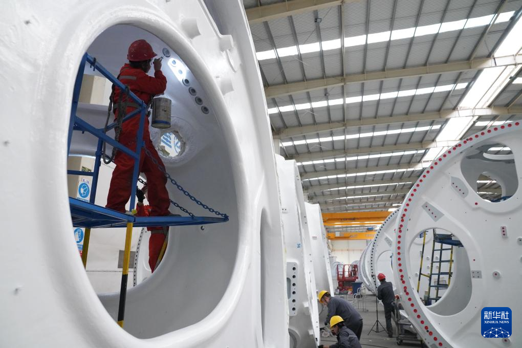 10月8日,在惠民县风电装备制造产业园涂装车间,工人在涂装风电轮毂。