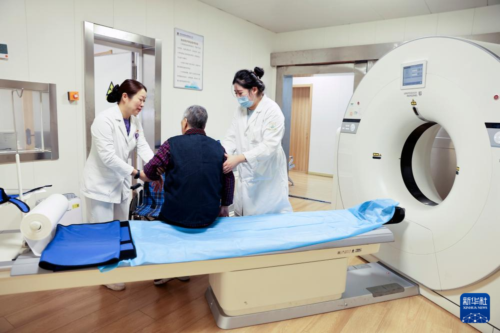 10月9日,在乾元镇中心卫生院,镇医康养中心护士长潘建英(左)陪同老人进行CT检查。