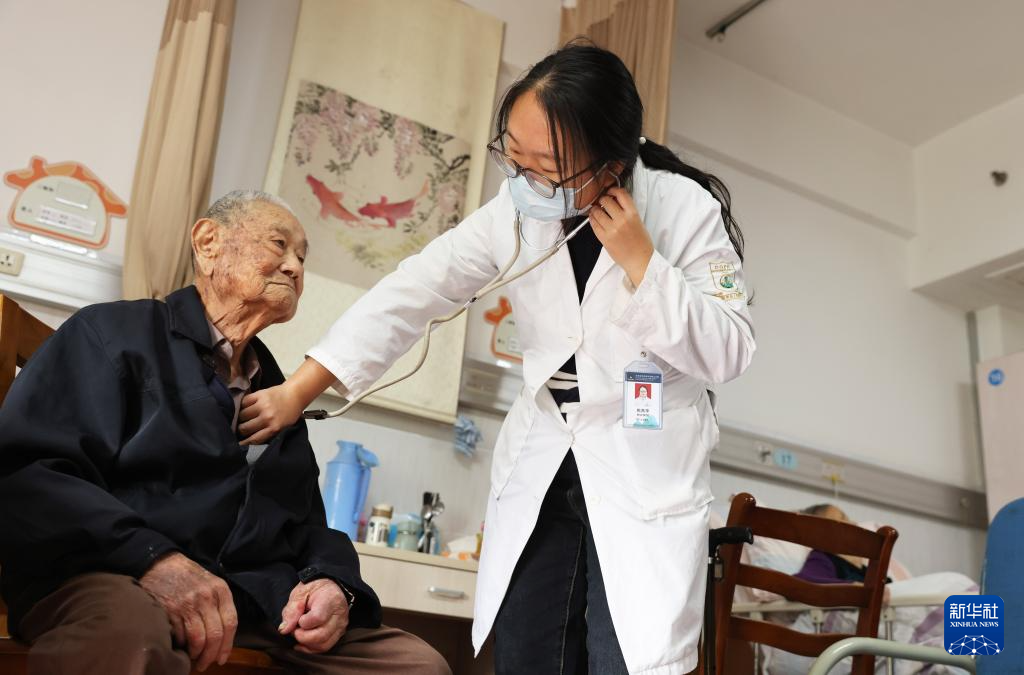 10月9日,在乾元镇医康养中心,镇中心卫生院医生为89岁的张文元老人检查身体。