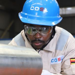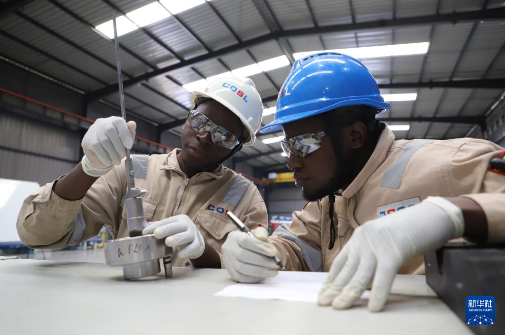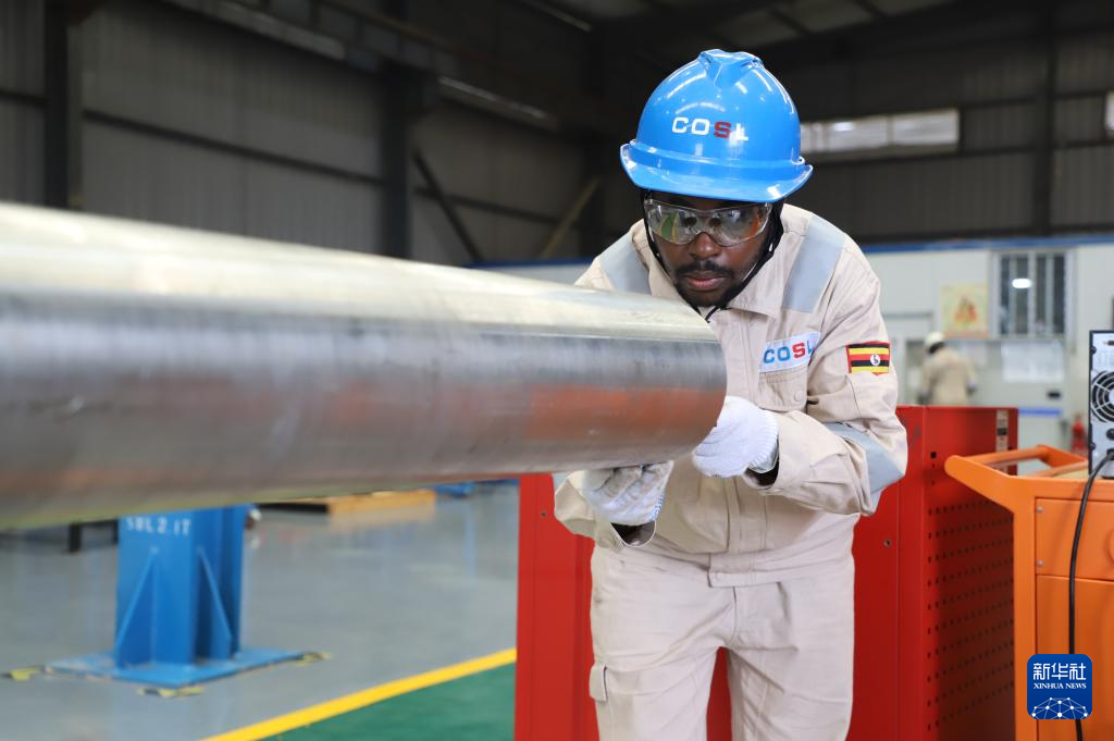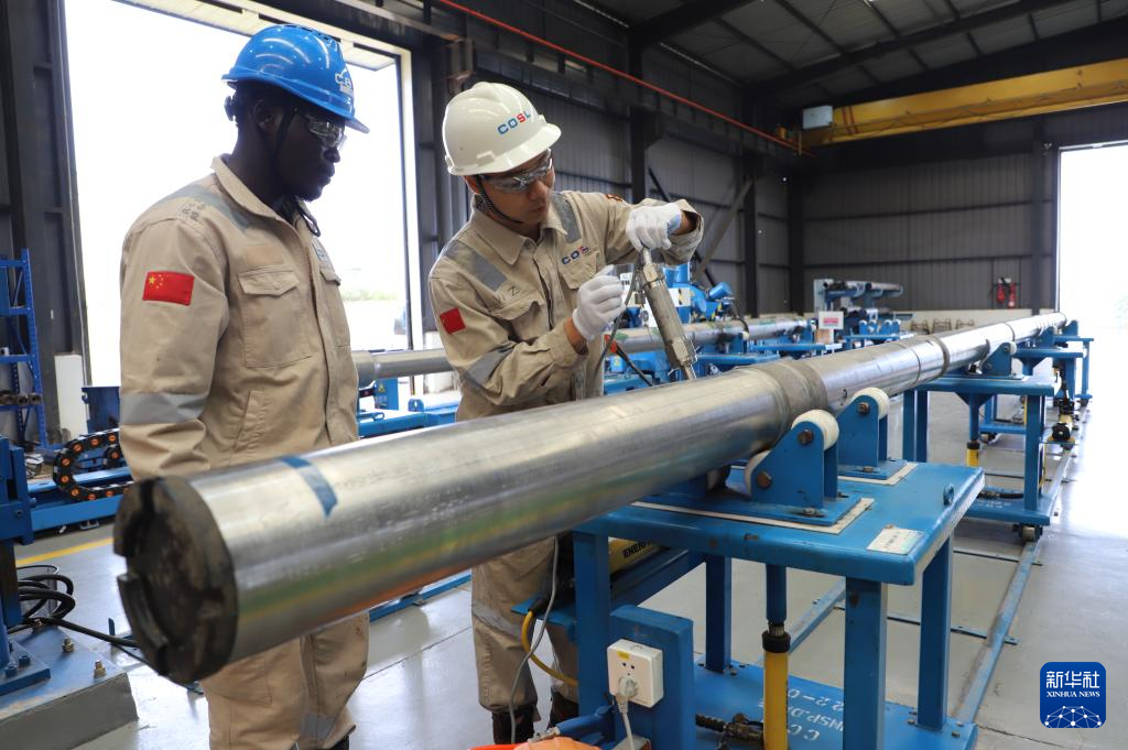 8月22日,在乌干达西部翠鸟油田项目的“璇玑”系统维保车间,工作人员对“璇玑”系统工具部件进行测量。