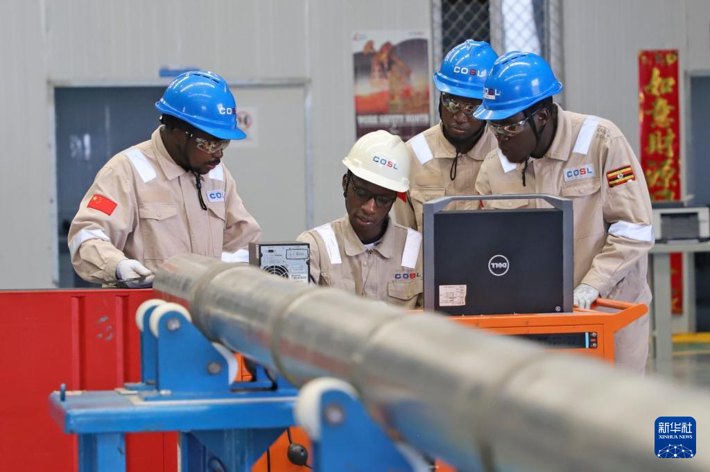 8月22日,在乌干达西部的翠鸟油田项目现场,来自中国和乌干达的工作人员对“璇玑”系统工具进行测量。