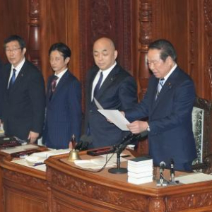 10月9日,日本众议院议长额贺福志郎(右一)在首都东京举行的众议院全体会议上宣读解散诏书。