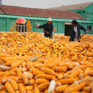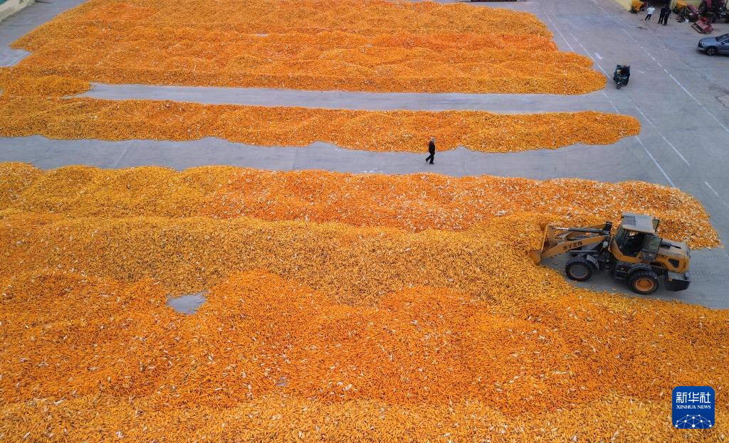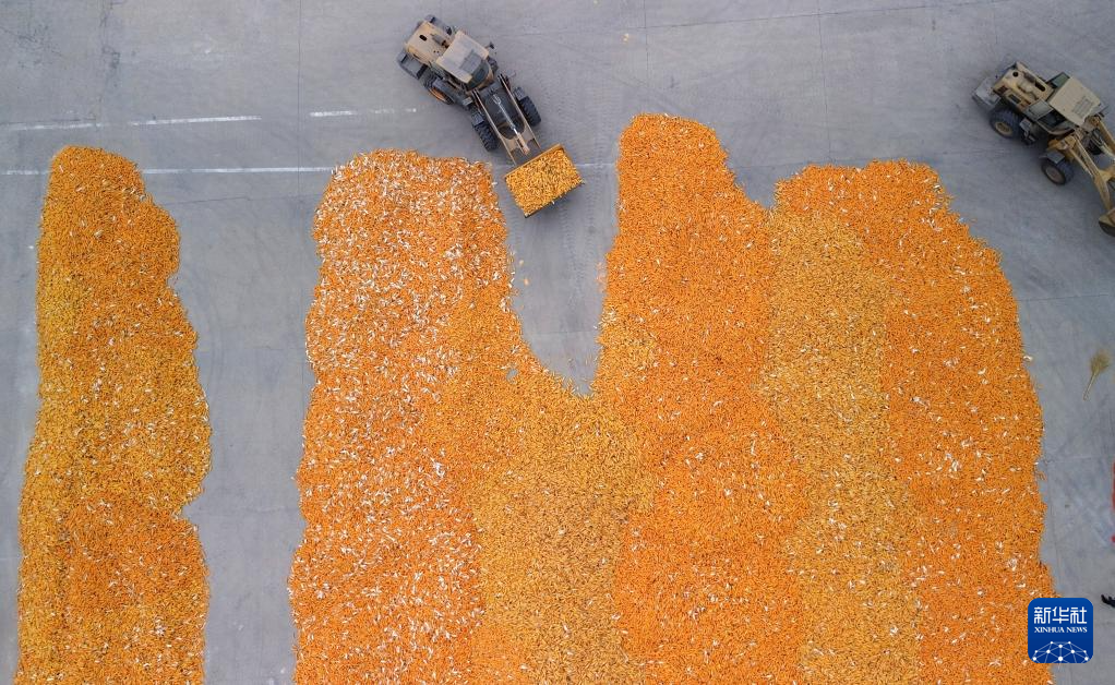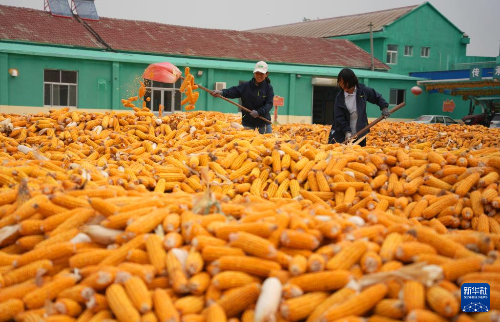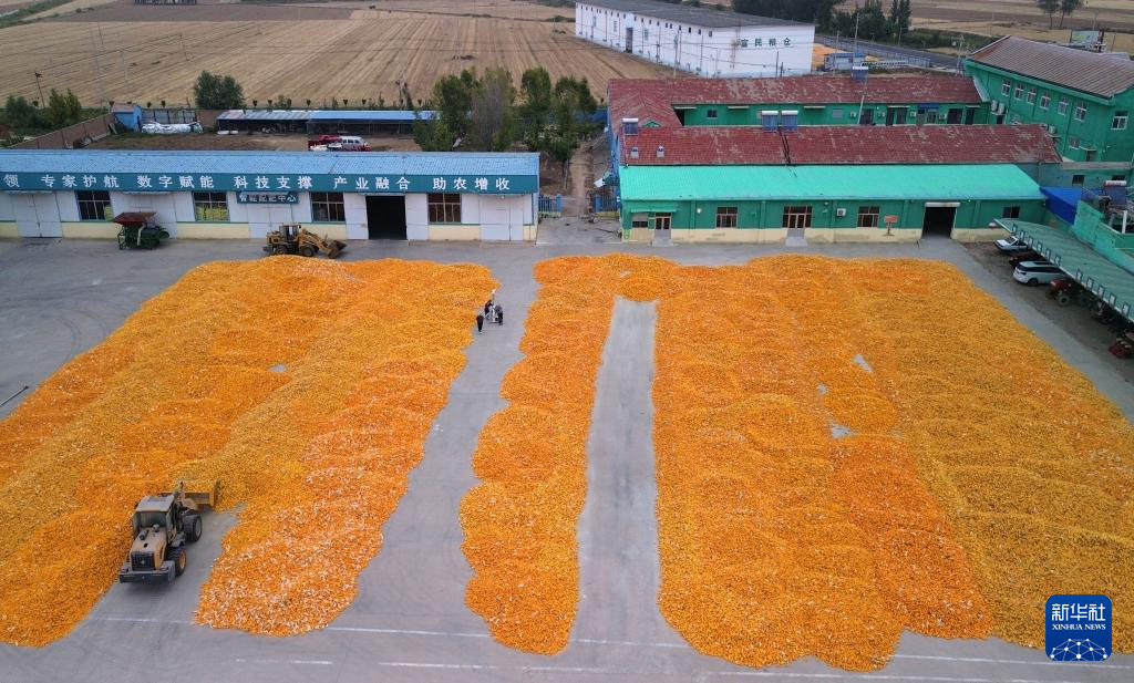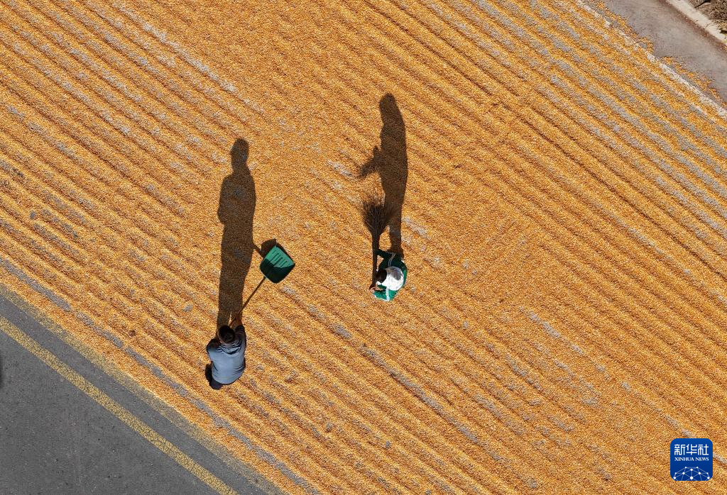 10月9日,在山东省临邑县德平镇,农户在晾晒刚收获的玉米。