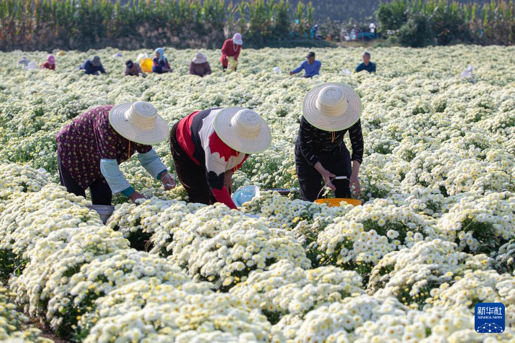 10月8日,农民在山东省淄博市高青县黑里寨镇官圣村采收菊花。