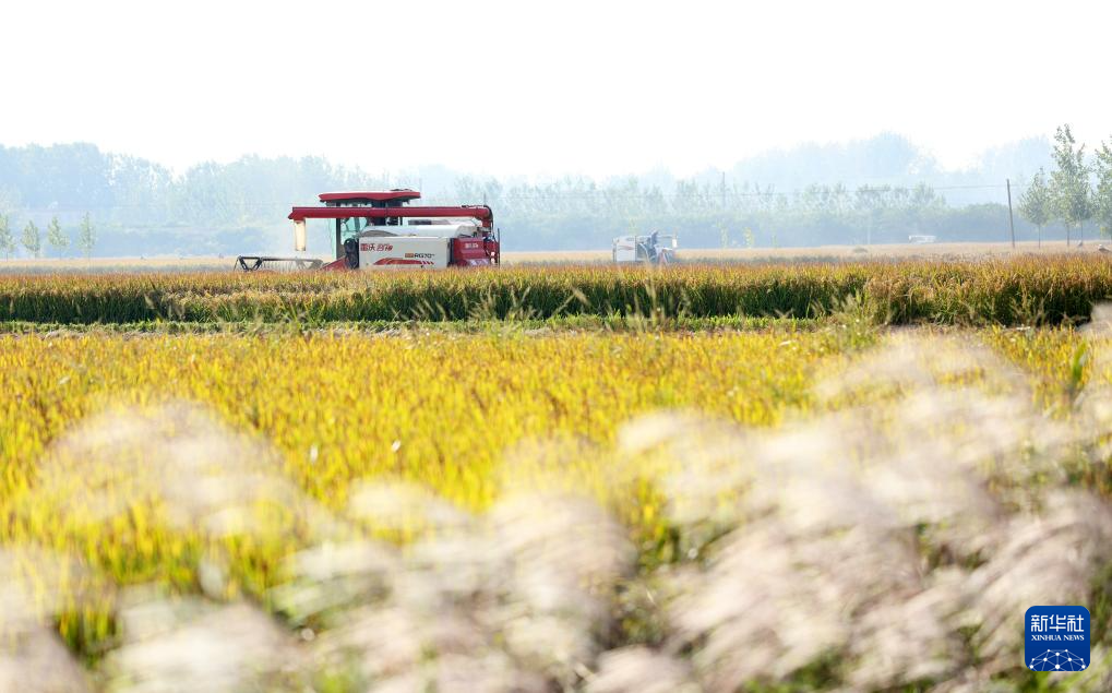 10月8日,收割机在山东省临沂市郯城县郯城街道田间收割水稻。