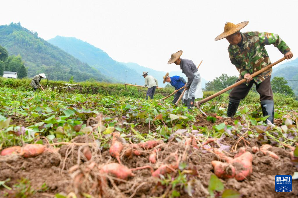 10月9日,在浙江省金华市武义县俞源乡后陶村“共富薯田”,村民们在收获小香薯。
