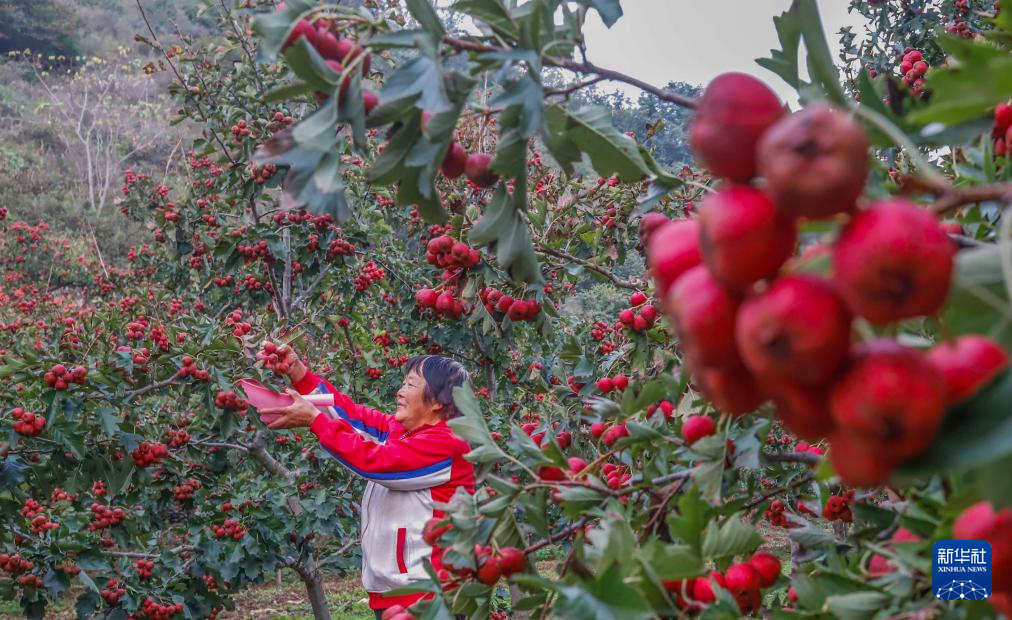 10月9日,河北省遵化市刘备寨乡农民在收获山楂。