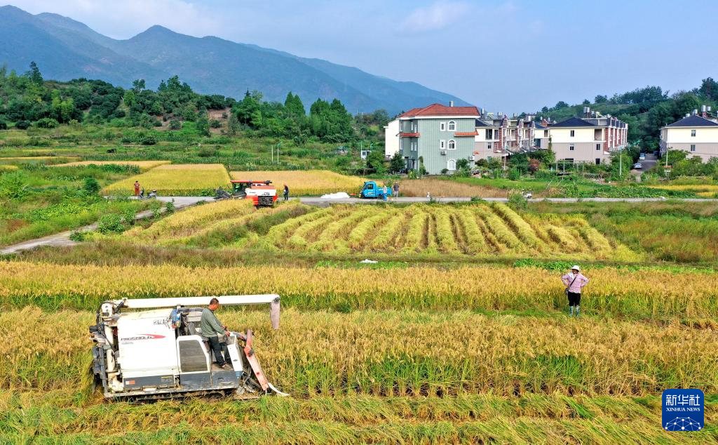 10月9日,农机手驾驶收割机在浙江省湖州市德清县新安镇收割晚稻。