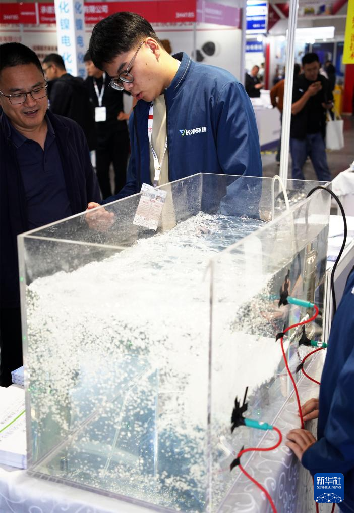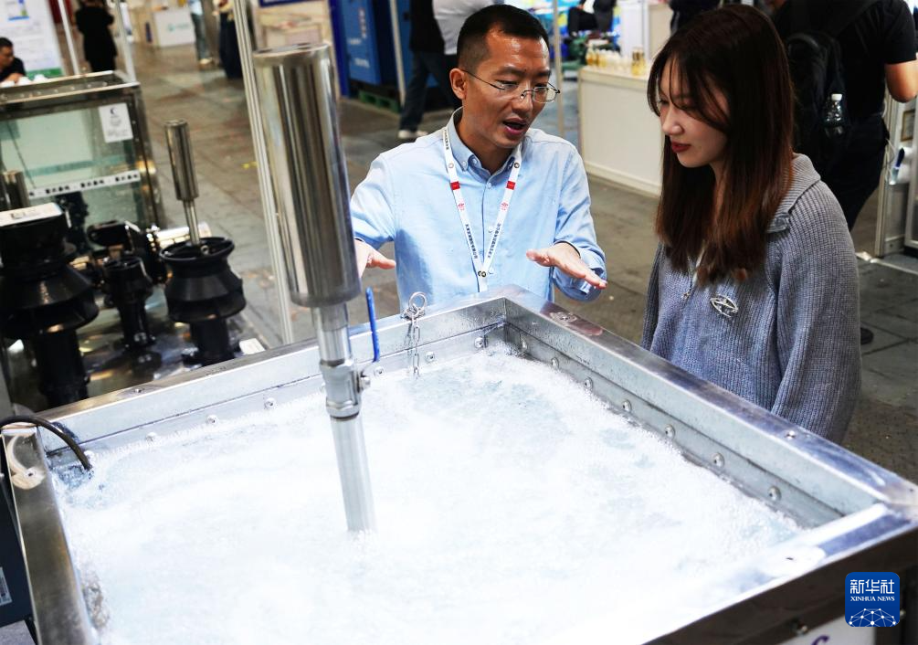 10月9日,工作人员向观众介绍一款新型污水净化设备。
