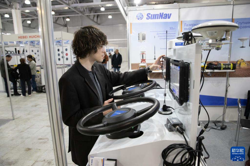 10月9日,在俄罗斯莫斯科州,一名观众试用中国企业生产的拖拉机导航设备。