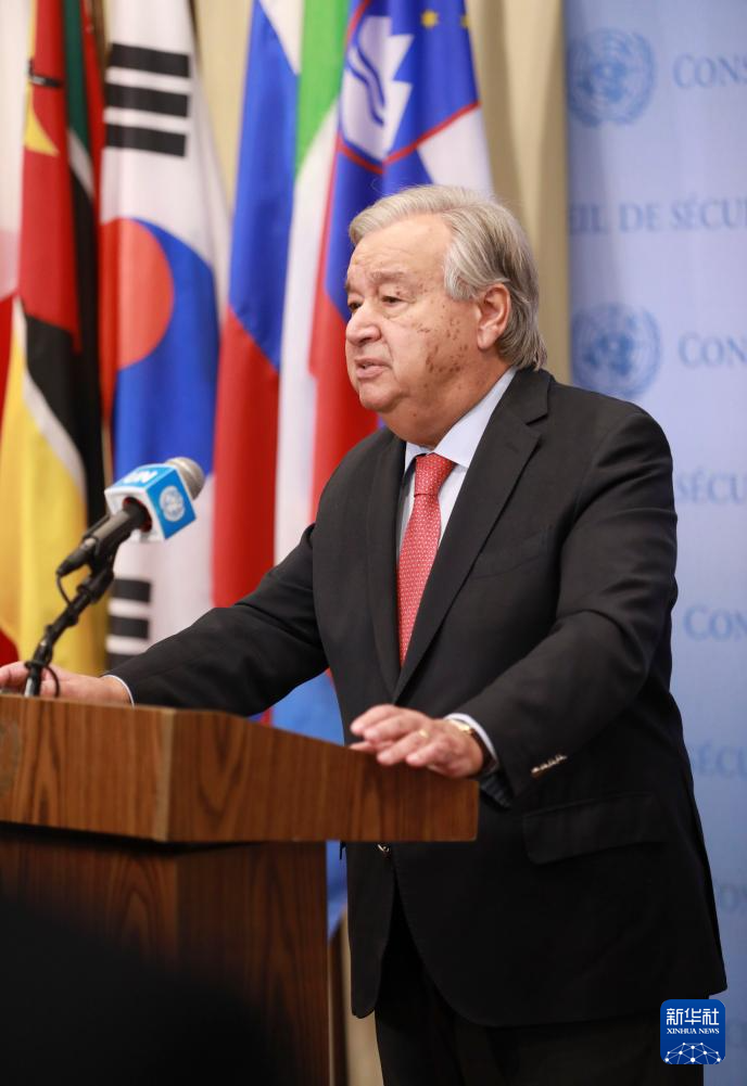 10月8日,在位于纽约的联合国总部,联合国秘书长古特雷斯(上右一)对媒体讲话。