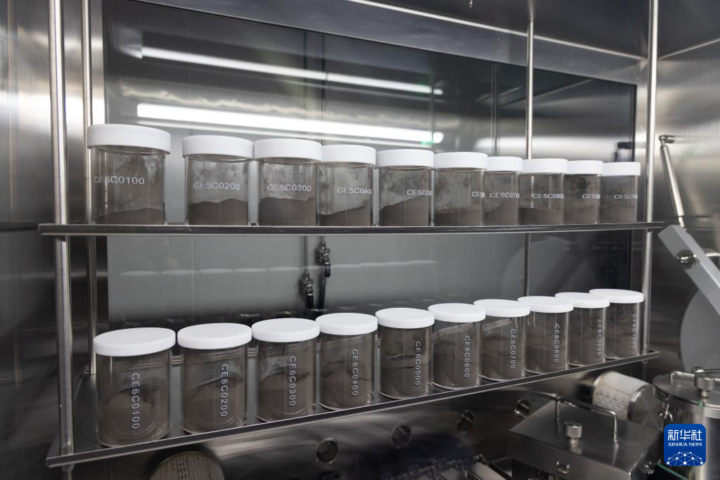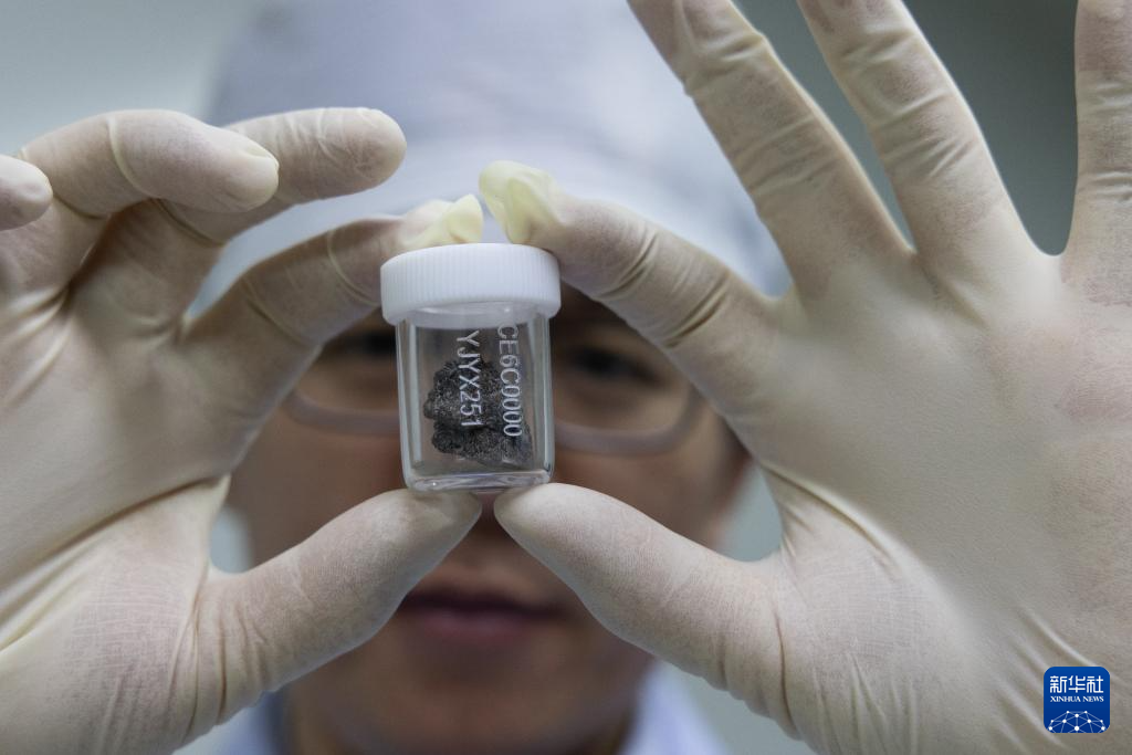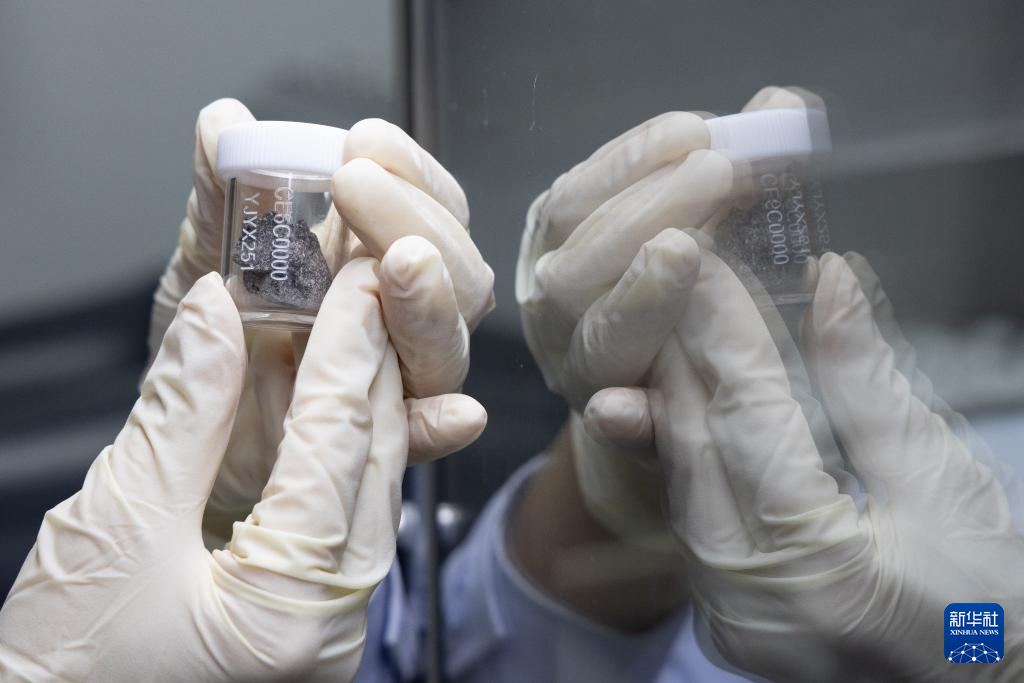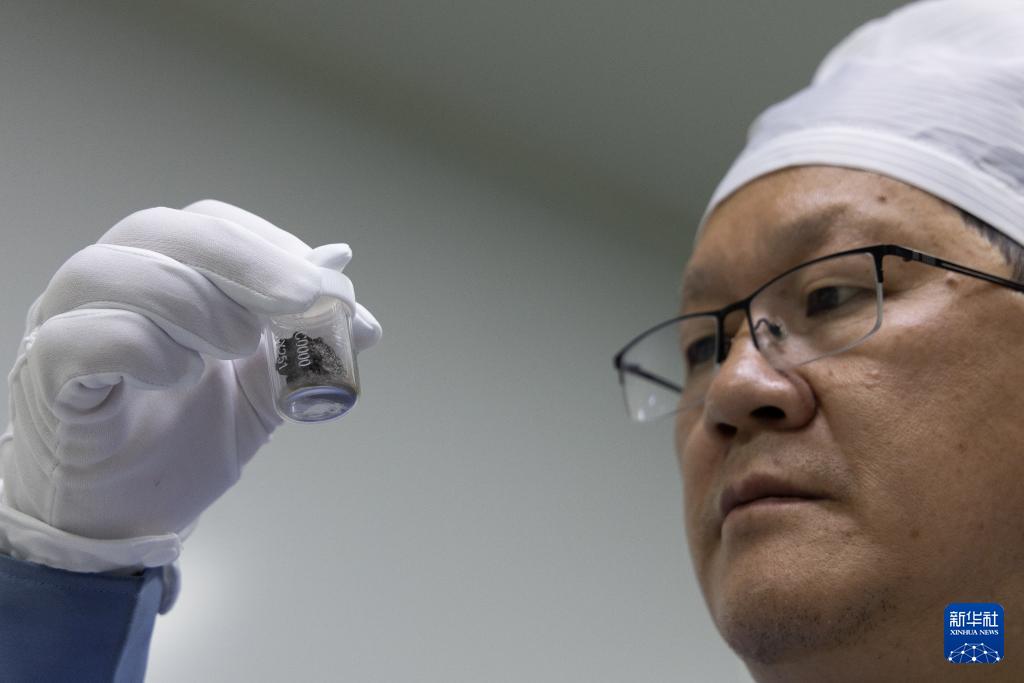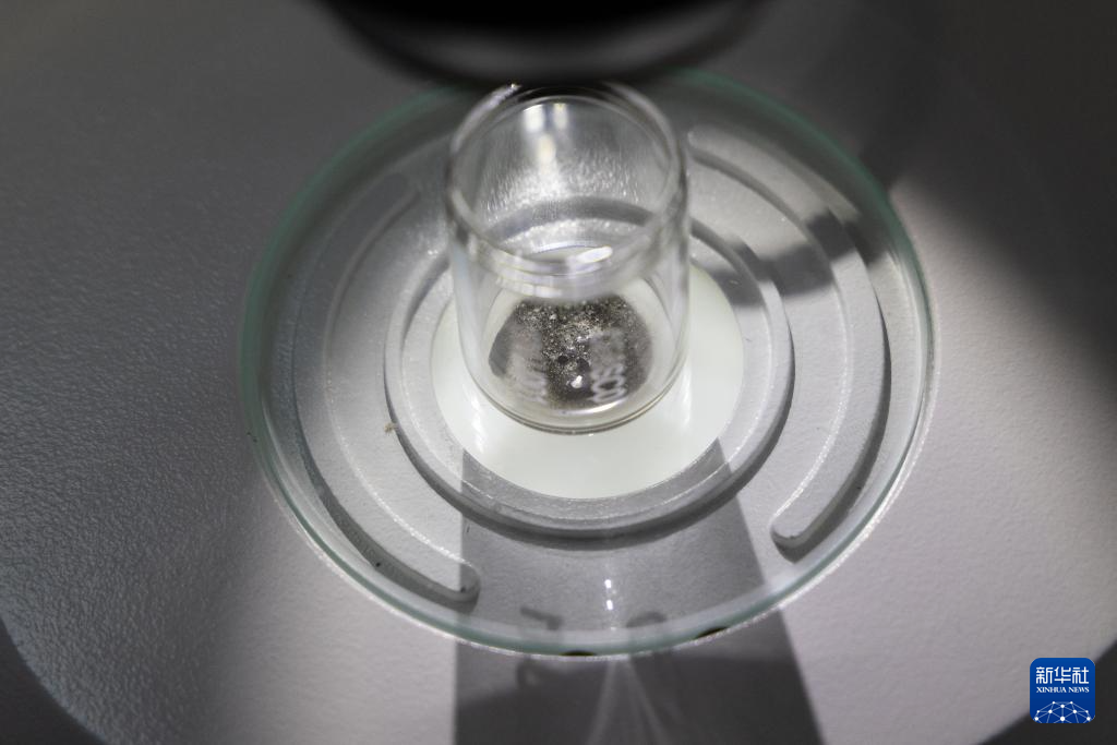 9月24日,科研人员在月球样品实验室展示嫦娥六号月球样品。