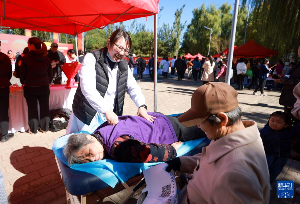 10月10日,老年人在朝阳区“敬老月”主题活动上体验按摩服务。