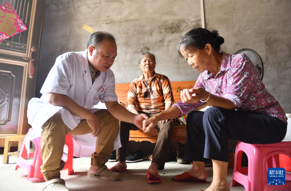 在柳州市鹿寨县四排镇江南村,50岁的村医覃文荣(左)给村民看病(9月30日摄)。