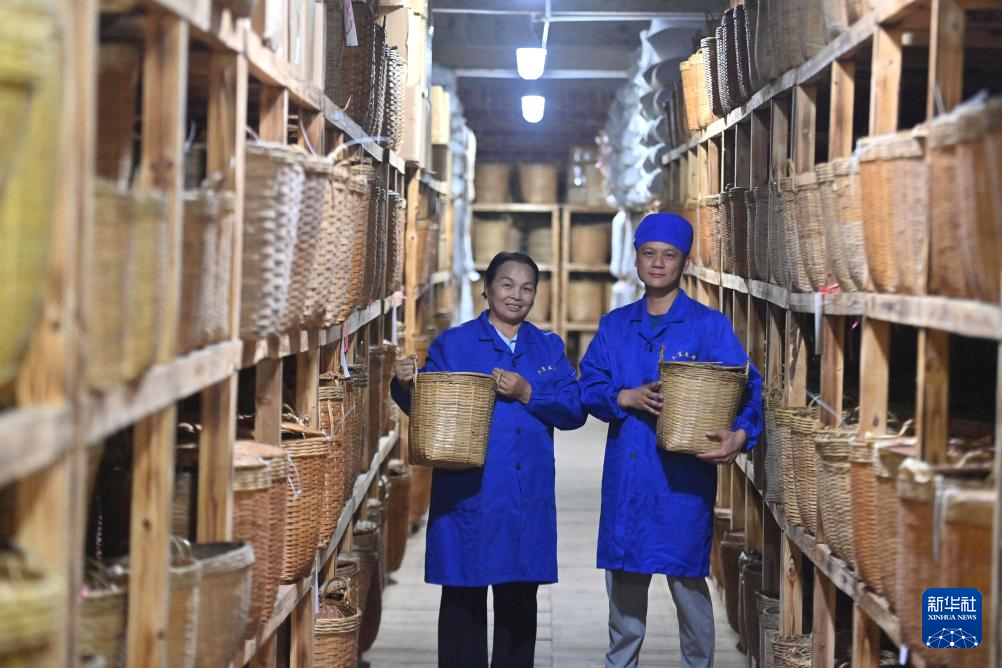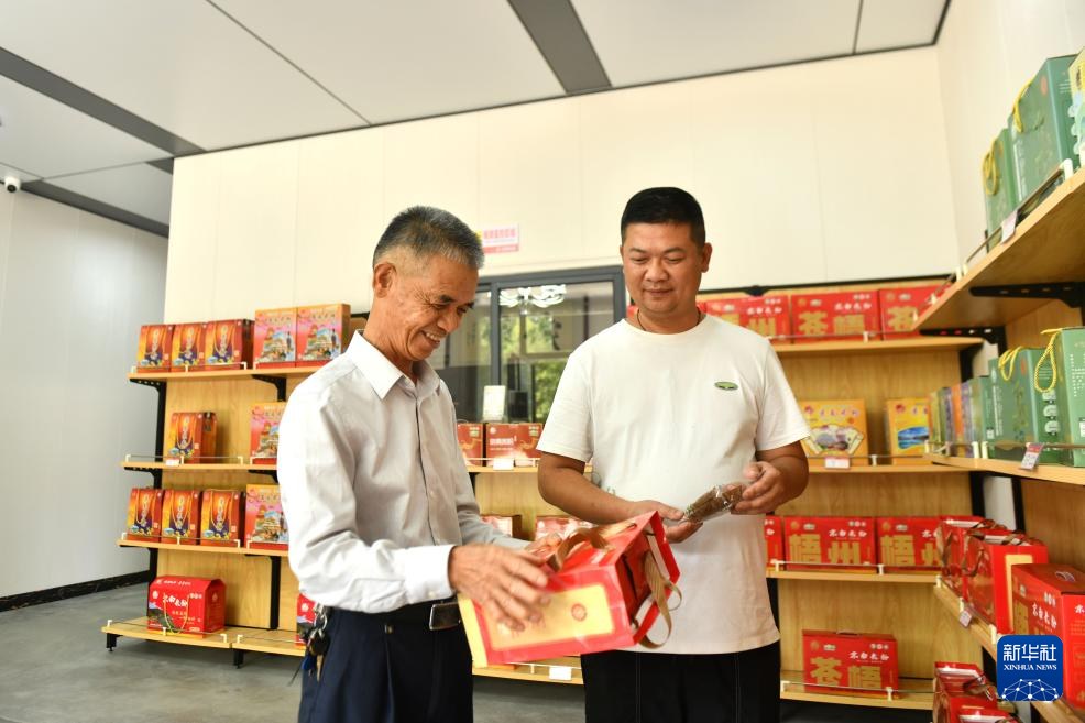 在梧州市苍梧县六堡镇四柳村,37岁的吴峻(右)和63岁的母亲谭爱云在展示六堡茶(10月9日摄)。谭爱云是六堡茶制作技艺自治区级非遗传承人,在村里经营一家茶企,种有1000多亩茶园。几年前,儿子吴峻回到家乡,帮助母亲分担压力。