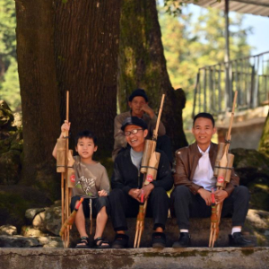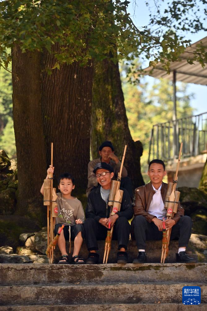 在融水苗族自治县杆洞乡党鸠村乌英苗寨,梁秀前(右)和父亲梁安合(中)、儿子梁文雄(左)合影(10月5日摄)。45岁的梁秀前返乡创业已十多年,是乌英苗寨芦笙队队长,经常带队参赛,且多次获得优异成绩。梁安合希望儿子把乌英芦笙吹到更远的地方。