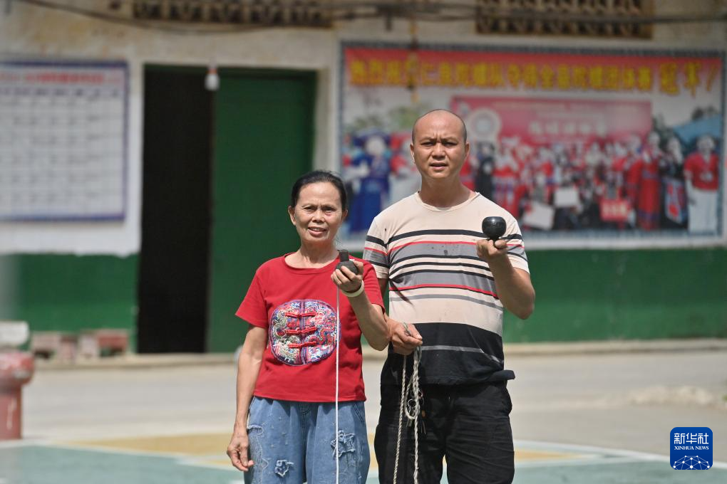 在广西大化瑶族自治县大化镇仁良村,45岁的村民韦寿基(右)和母亲韦玉春合影(9月29日摄)。近年来,在驻村工作队的带领下,韦寿基每周都会组织村里的老人打陀螺、唱山歌、跳民族舞蹈,振兴家乡的民族文化,让“妈妈找回童年的快乐”。