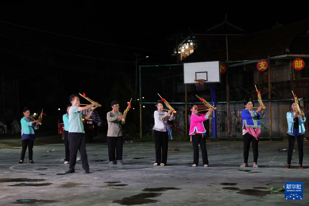 在融水苗族自治县杆洞乡党鸠村乌英苗寨,梁秀前(前)和父亲梁安合(后右五)在吹芦笙(9月10日摄)。45岁的梁秀前返乡创业已十多年,是乌英苗寨芦笙队队长,经常带队参赛,且多次获得优异成绩。梁安合希望儿子把乌英芦笙吹到更远的地方。