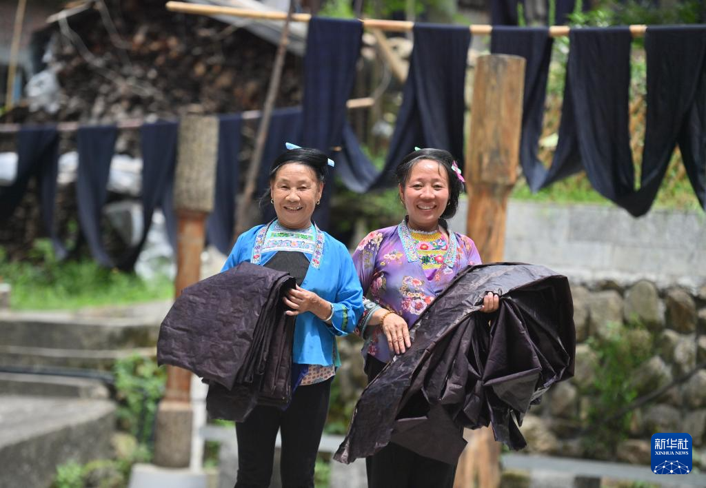 在融水苗族自治县杆洞乡党鸠村乌英苗寨,48岁的苗族妇女梁足英(右)和71岁的母亲梁英迷在展示刚刚做好的亮布(8月10日摄)。亮布是当地苗族传统手工布料,制作要经过浸染、捶打、晾晒和涂蛋清等多道工序。梁足英从小就跟着母亲梁英迷学习捶亮布,如今每年她们都在一起制作亮布。