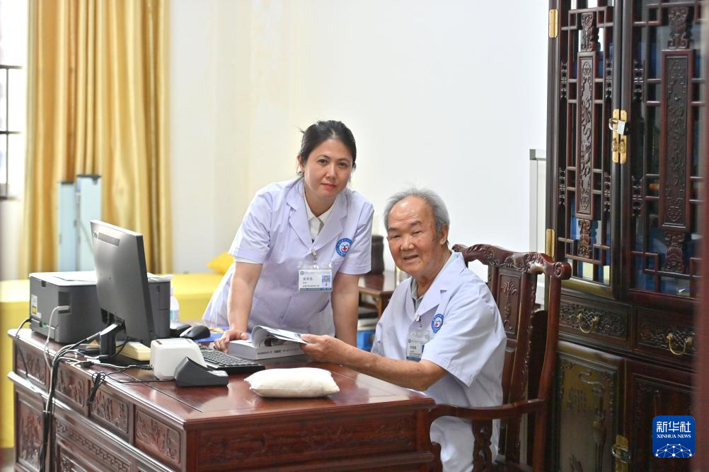 在梧州市中医医院,余永志(左)和父亲余培南在办公室合影(10月8日摄)。84岁的广西名老中医余培南“悬壶济世”近60年,一生致力于民族医药研究和发展。50岁的余永志是余培南的女儿,受父亲影响,从小就对民族医药产生浓厚兴趣。从学校毕业后,余永志成为梧州市中医医院的医生。如今,她每天接送父亲上下班,照料父亲的生活起居。