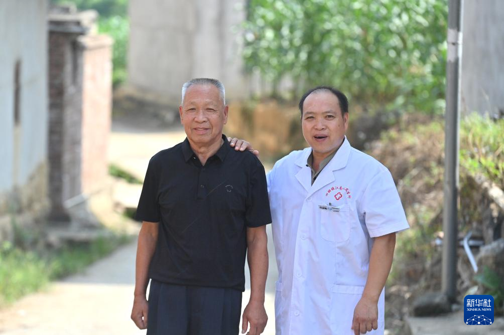 在柳州市鹿寨县四排镇江南村,50岁的村医覃文荣(右)和父亲覃绍文合影(9月30日摄)。今年76岁的覃绍文从1967年开始担任江南村的村医,一直干到2013年退休。2003年,覃文荣从卫校毕业后回到村里担任村医。