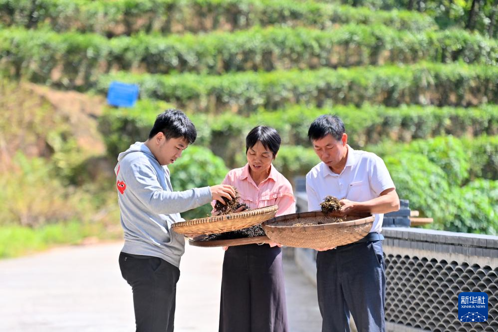 在梧州市苍梧县六堡镇大中村八集茶园,27岁的易丹洮(左)和父亲易章奇(右)、母亲黄洁燕在查看茶叶质量(10月9日摄)。2021年,易丹洮返乡创业,和父母一起种茶制茶。