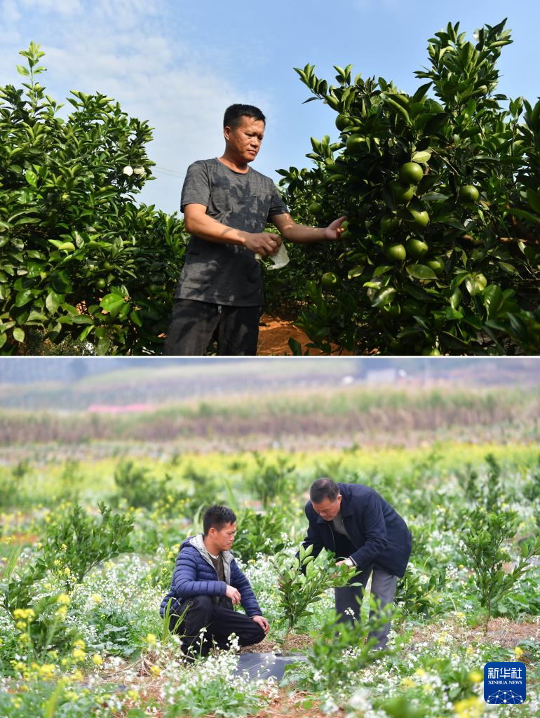 拼版照片:上图为廖学华在果园护理水果(9月30日摄);下图为廖学华(左)和父亲廖厚安在果园里查看果苗的生长情况(2020年1月3日摄)。74岁的廖厚安是鹿寨县较早一批通过种植蜜橙实现脱贫致富的农民,是当地闻名的种植专家。45岁的儿子廖学华已接过父亲的事业,并成立专业合作社,带领村民种植蜜橙200多亩,年产销100多万斤。