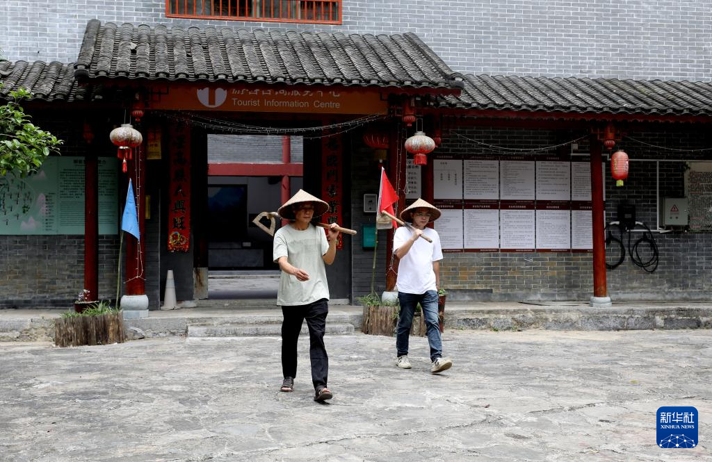 在融安县东起乡崖脚村铜板屯,37岁的龙箫宇(右)和61岁的父亲龙飞任准备上山护理果树(7月23日摄)。2017年,龙箫宇回到融安县创业,和父辈们一起开荒种树、开山修路,振兴家乡文旅产业。