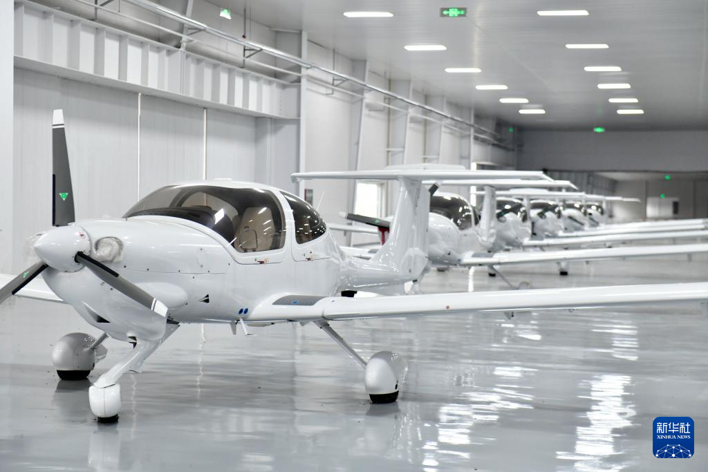 10月9日,在滨州市大高航空高新产业园,钻石DA40飞机被整齐停放在机库里。