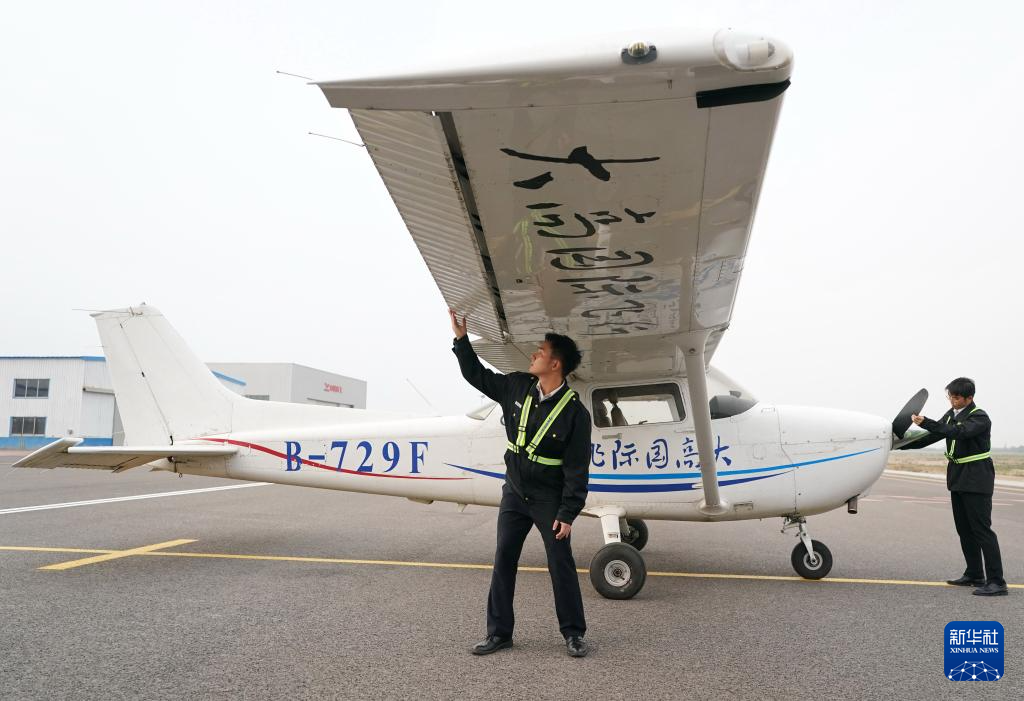 10月9日,在滨州市大高通用机场,飞行学员在飞行训练前检查飞机状态。