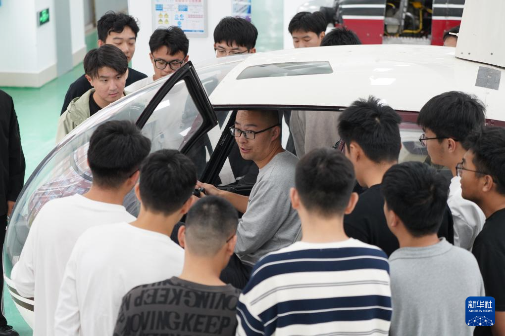 10月9日,在山东航空学院,飞行学院教师孟德印(中)在对学生进行航空器结构实训。