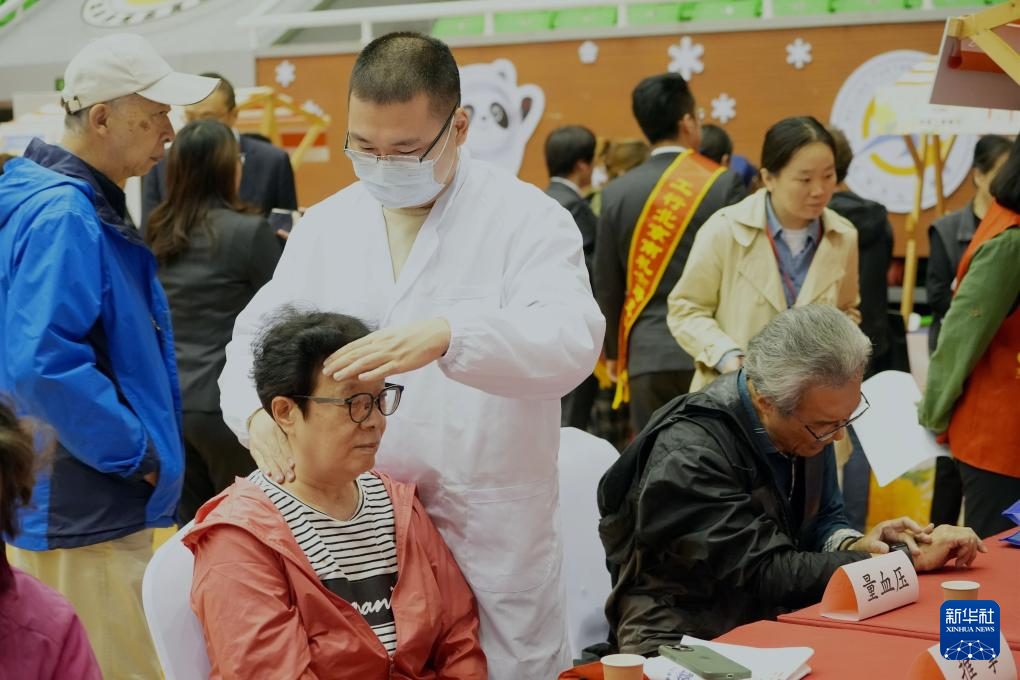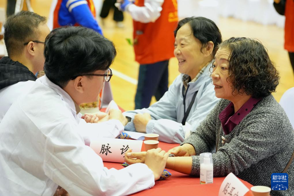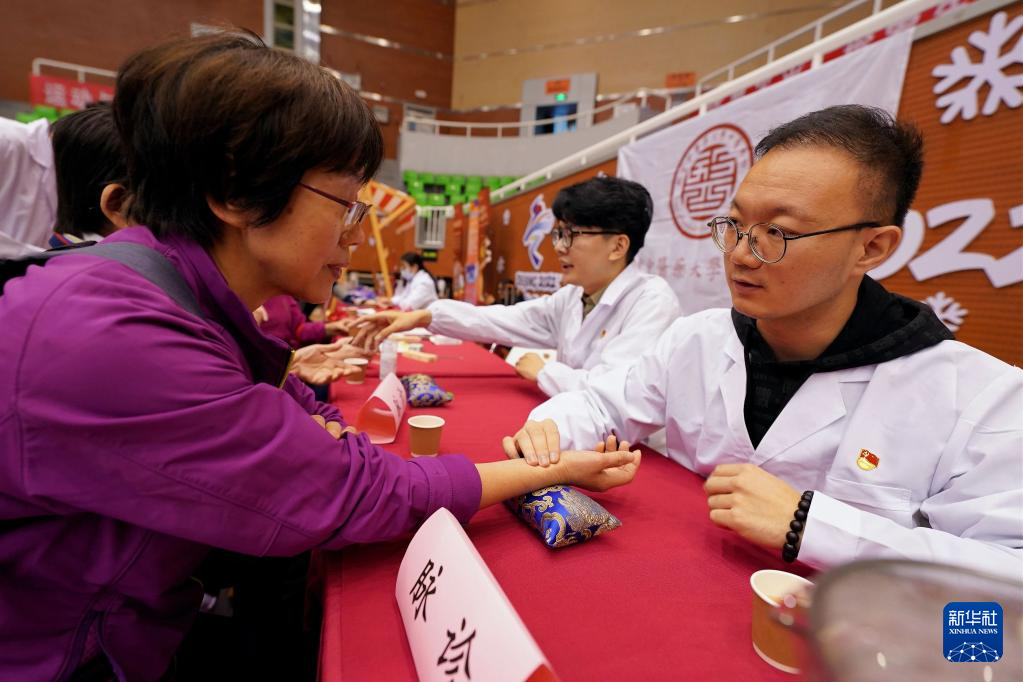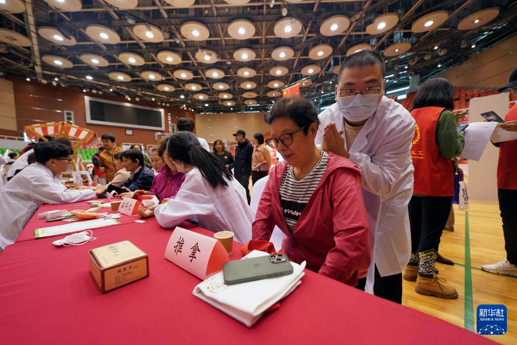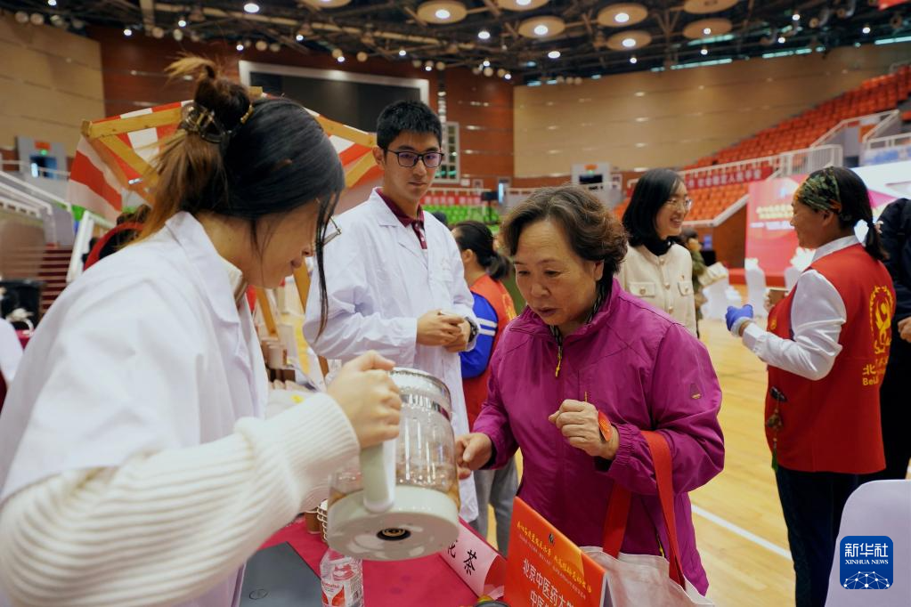 当日,2024年北京月坛街道重阳节为老服务市集活动在月坛体育馆举行。北京中医药大学中医学院的志愿者用自己所学的专业知识在市集上为老年人服务,迎接重阳节。