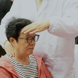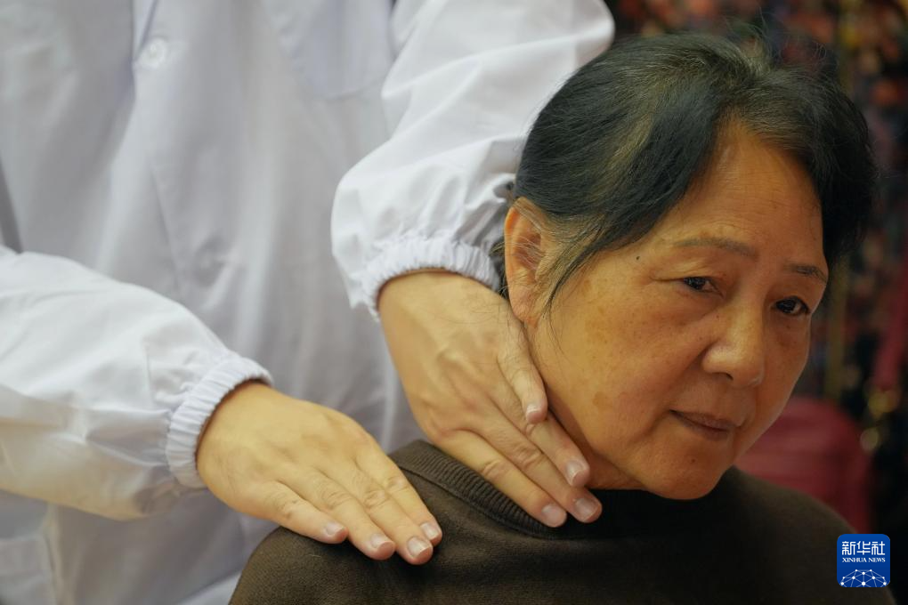 10月10日,北京中医药大学中医学院的志愿者在月坛体育馆为老人服务。