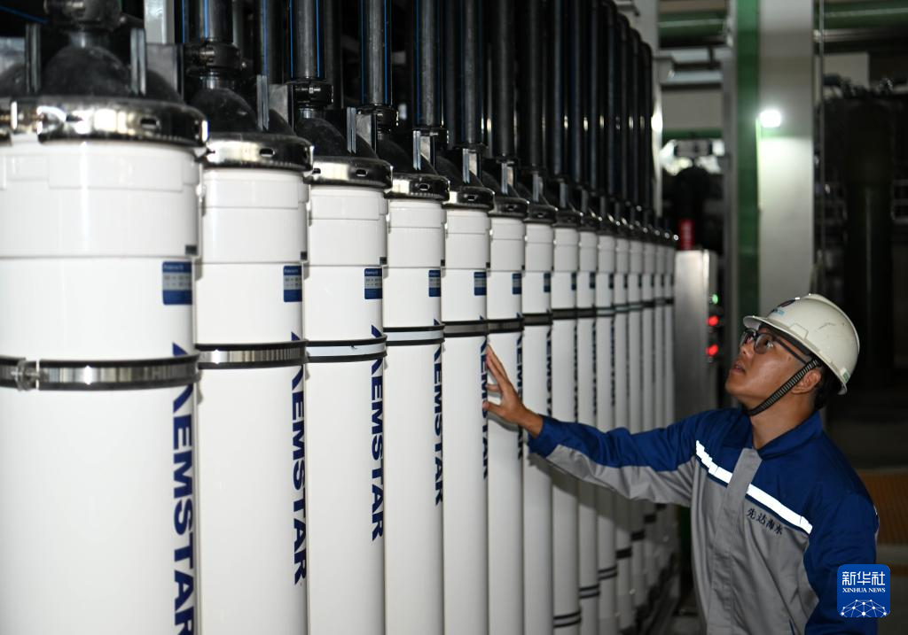 10月10日,在位于天津南港工业区的先达(天津)海水资源开发有限公司海水淡化主装置生产车间,工作人员在巡检设备。
