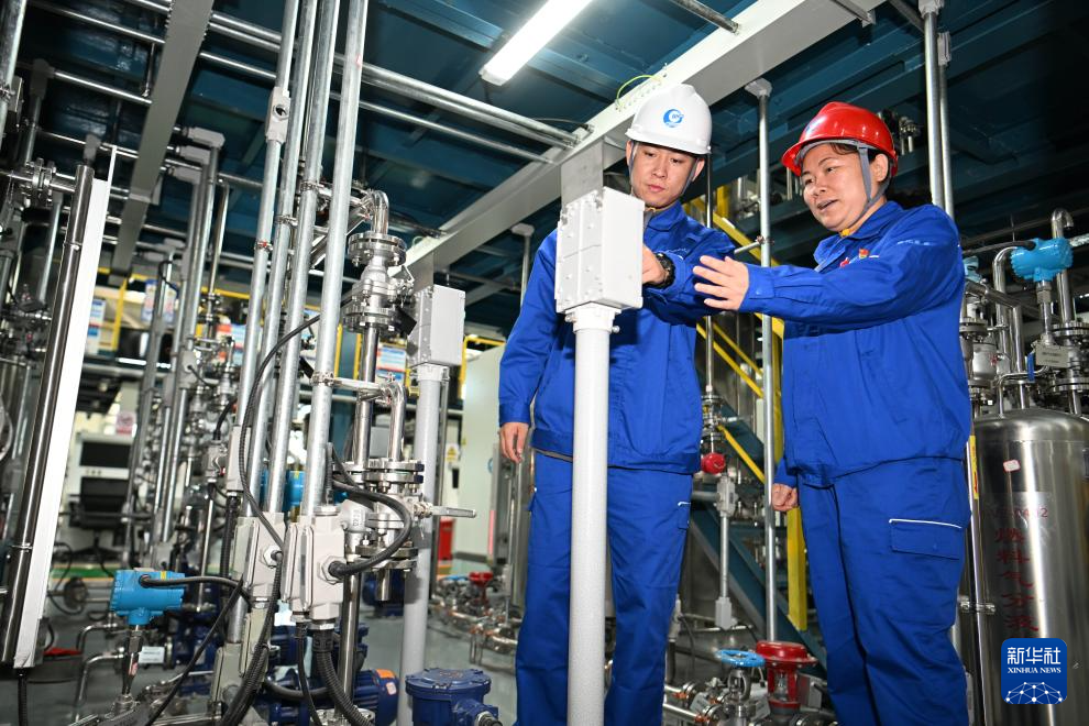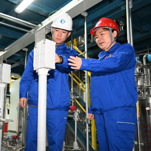 10月10日,在位于南港工业区的中石化催化剂天津新材料生产基地银催化剂车间,工作人员在巡检设备。