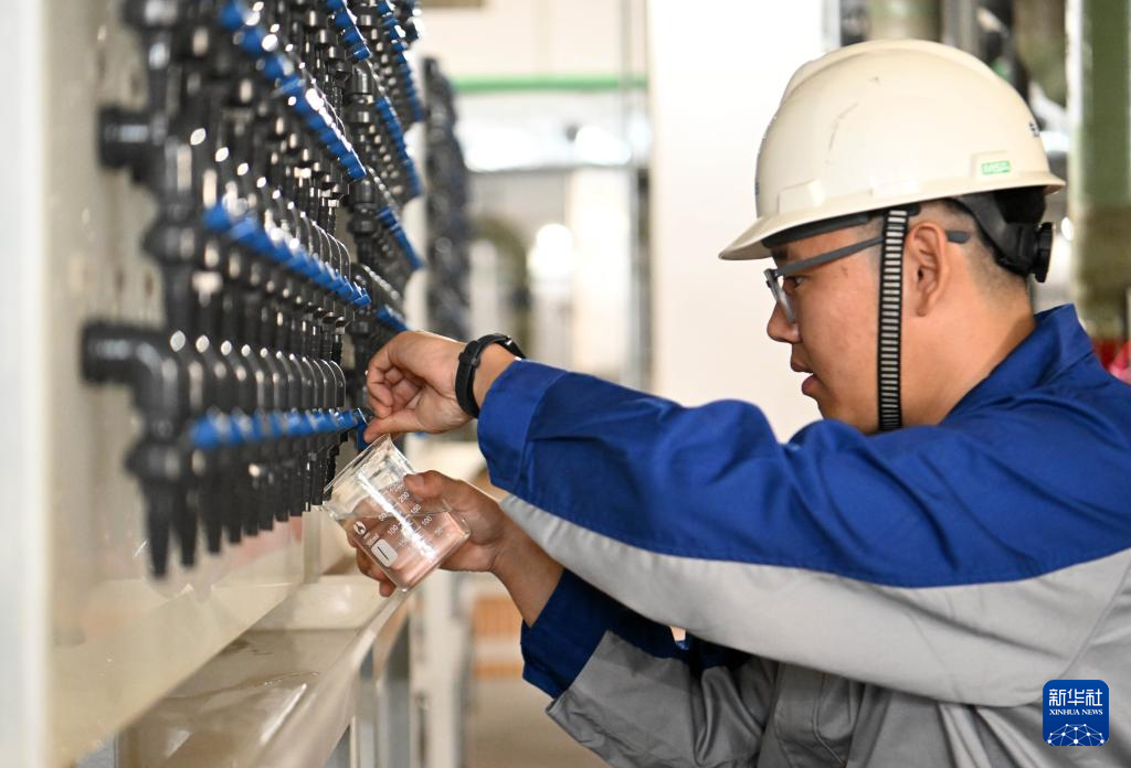10月10日,在位于天津南港工业区的先达(天津)海水资源开发有限公司海水淡化主装置生产车间,工作人员在取样淡水。