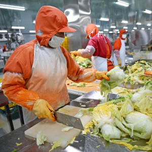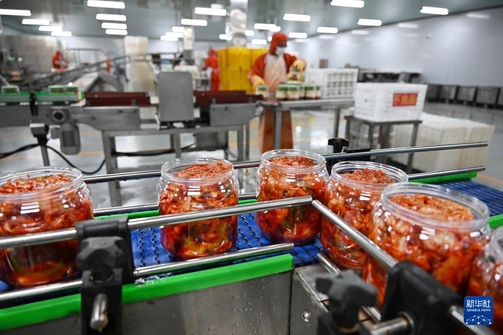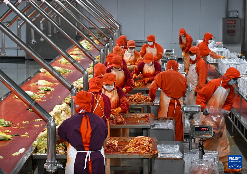 10月11日,青岛一家食品企业职工在加工韩式泡菜。