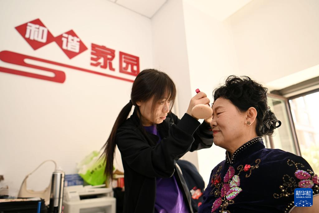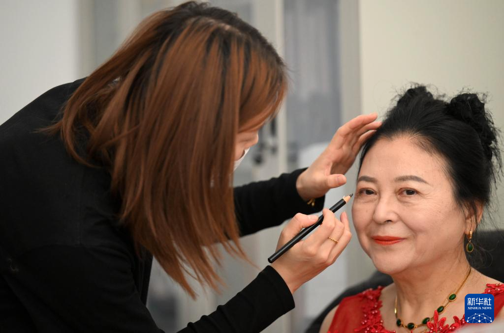 10月11日,工作人员在天津市和平区小白楼街道长春道社区居委会给社区老人化妆。