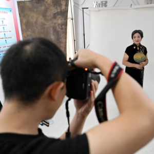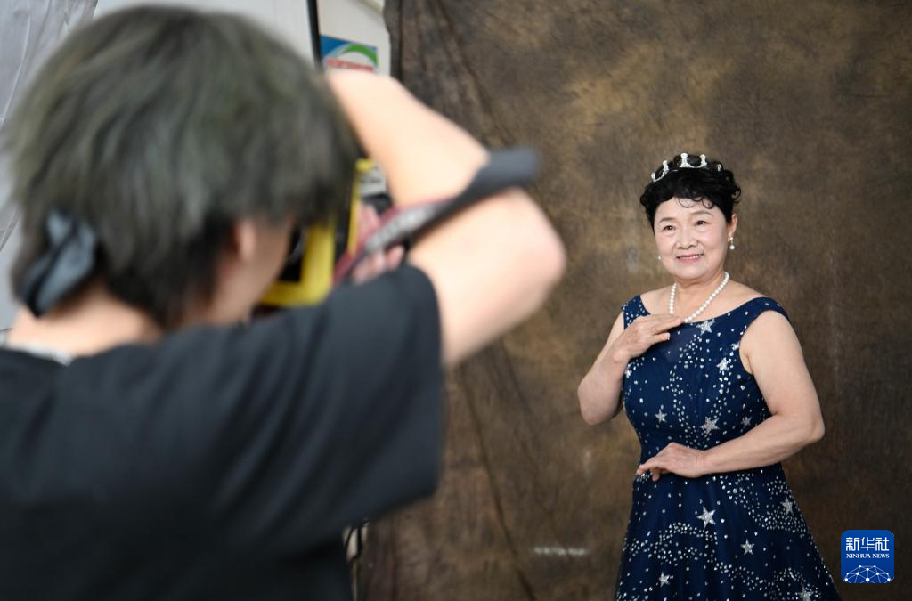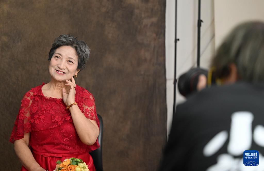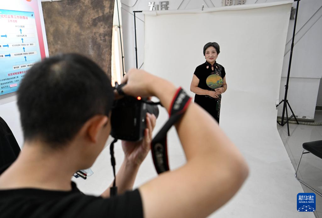 10月11日,工作人员在天津市和平区小白楼街道长春道社区居委会给社区老人拍形象照。