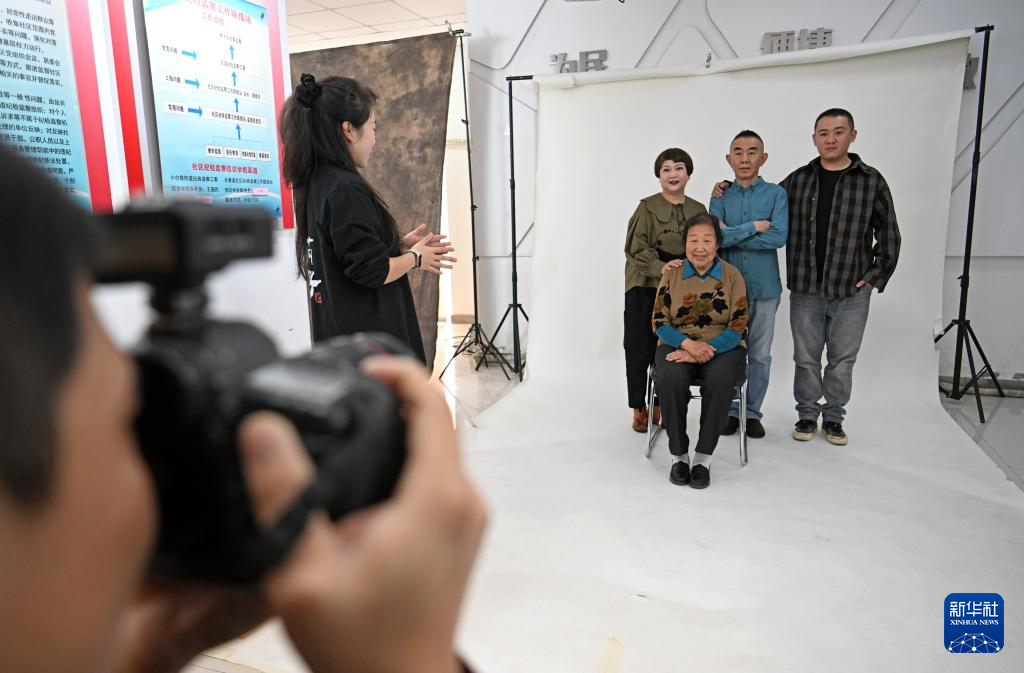 10月11日,工作人员在天津市和平区小白楼街道长春道社区居委会给社区老人拍全家福。