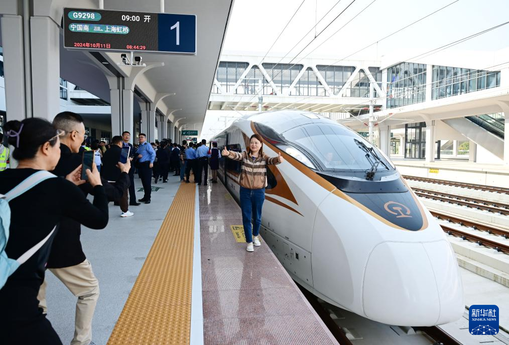 10月11日,乘坐宣绩高铁首发列车G9298次的旅客在宁国南站拍照留念。