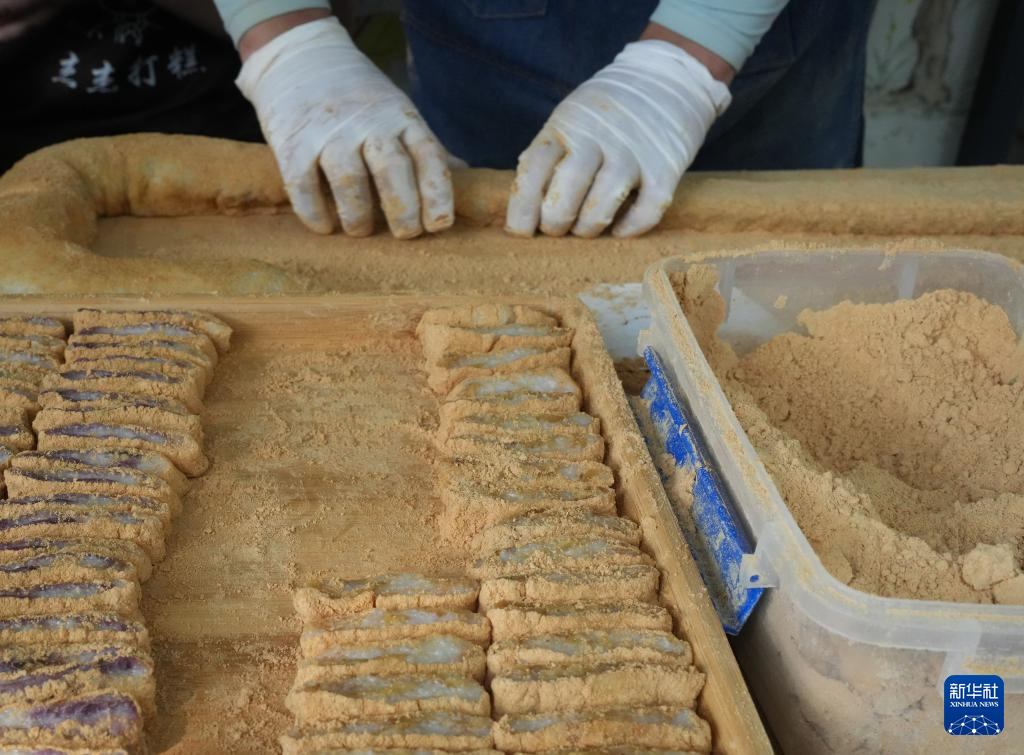 10月11日,一名商户在满觉陇街边制作桂花打糕。