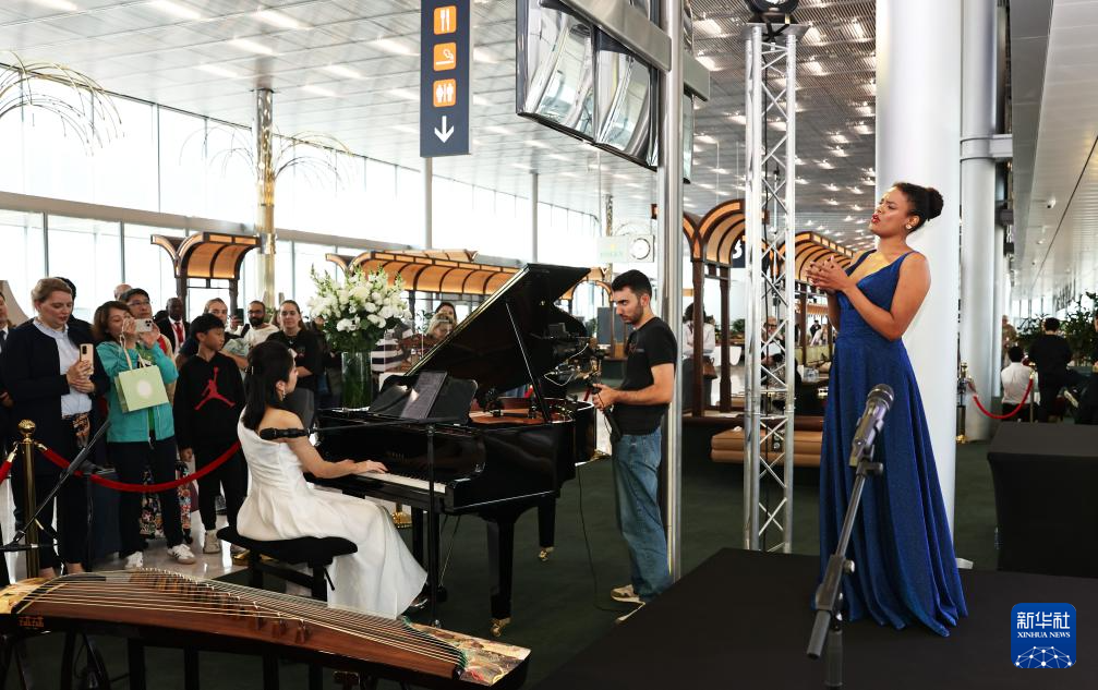 10月10日,在法国巴黎戴高乐机场举行的“中法金秋文化盛宴”活动上,曾在2024巴黎奥运会开幕式上独唱法国国歌《马赛曲》的法国女中音歌唱家阿克塞尔·圣齐蕾尔(右)在旅法音乐人李翘楚的钢琴伴奏下演唱歌曲。