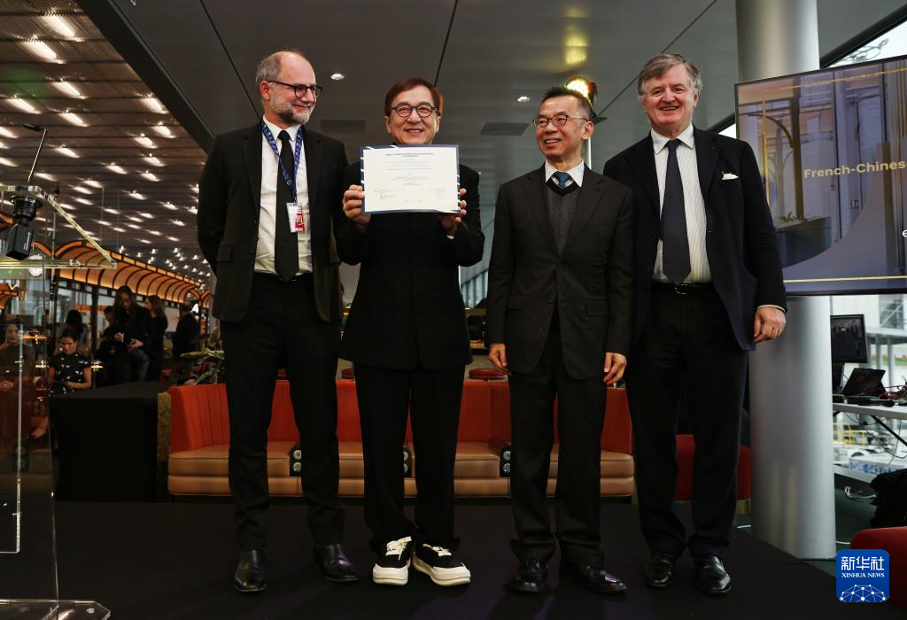 10月10日,在法国巴黎戴高乐机场举行的“中法金秋文化盛宴”活动上,巴黎机场管理局负责人奥古斯丁·德罗马内(右一)向出席活动的成龙(左二)授予“中法友好文化大使”称号。
