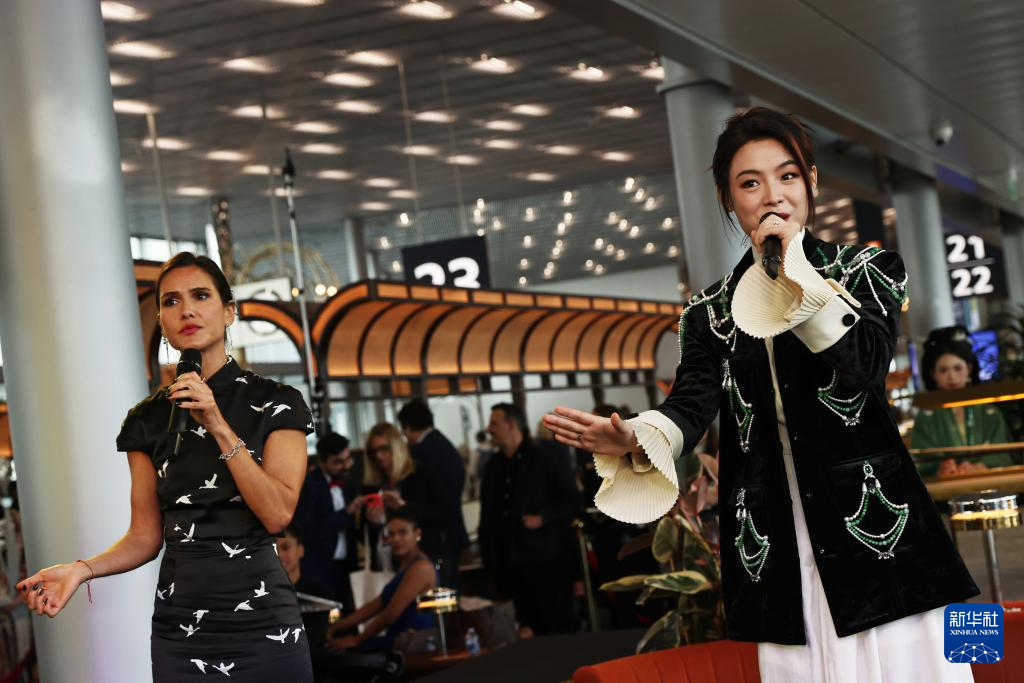 10月10日,在法国巴黎戴高乐机场举行的“中法金秋文化盛宴”活动上,法国歌手乔伊丝·乔纳森(右)和越剧演员陈丽君联袂演绎越剧选段。